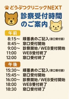 受付開始前の飼い主様同士のトラブルが後を絶たない為、今後は以下のようなルールを決めさせていただきます。 受付開始前にいらした順に玄関前にお並びください。並んでいる順に、順番表に名前を記入していただきます。 ※お車の中で順番を待つことはできません。 ※その際のトラブルには、当院は関与致しません。 ご協力の程、よろしくお願い致します。